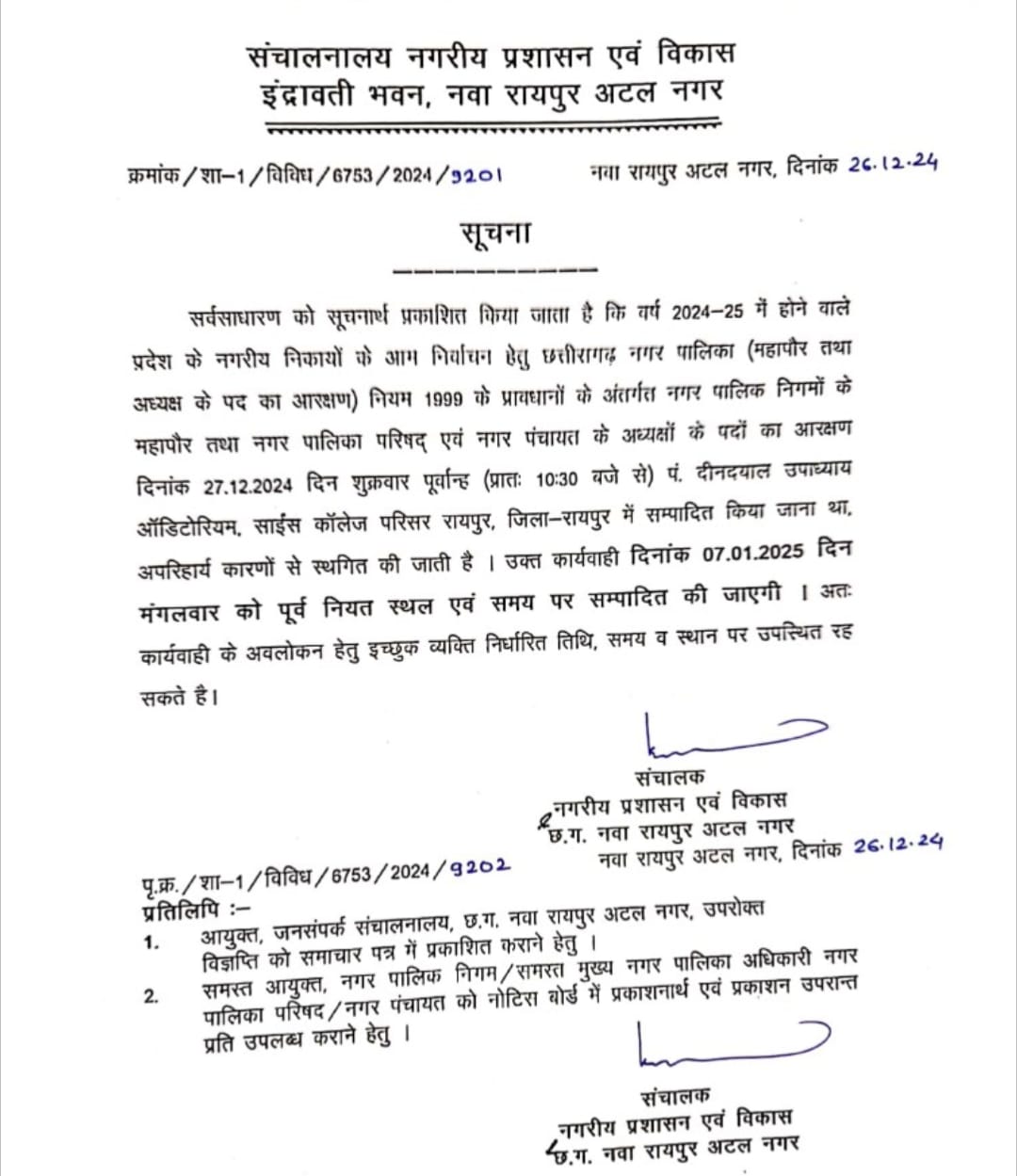 नगरीय निकायों की आरक्षण कार्रवाई स्थगित.. 27 दिसंबर को नहीं निकाली जाएगी पर्ची, सामने आई नई तारीख 26/12/2024 6:54 pm
