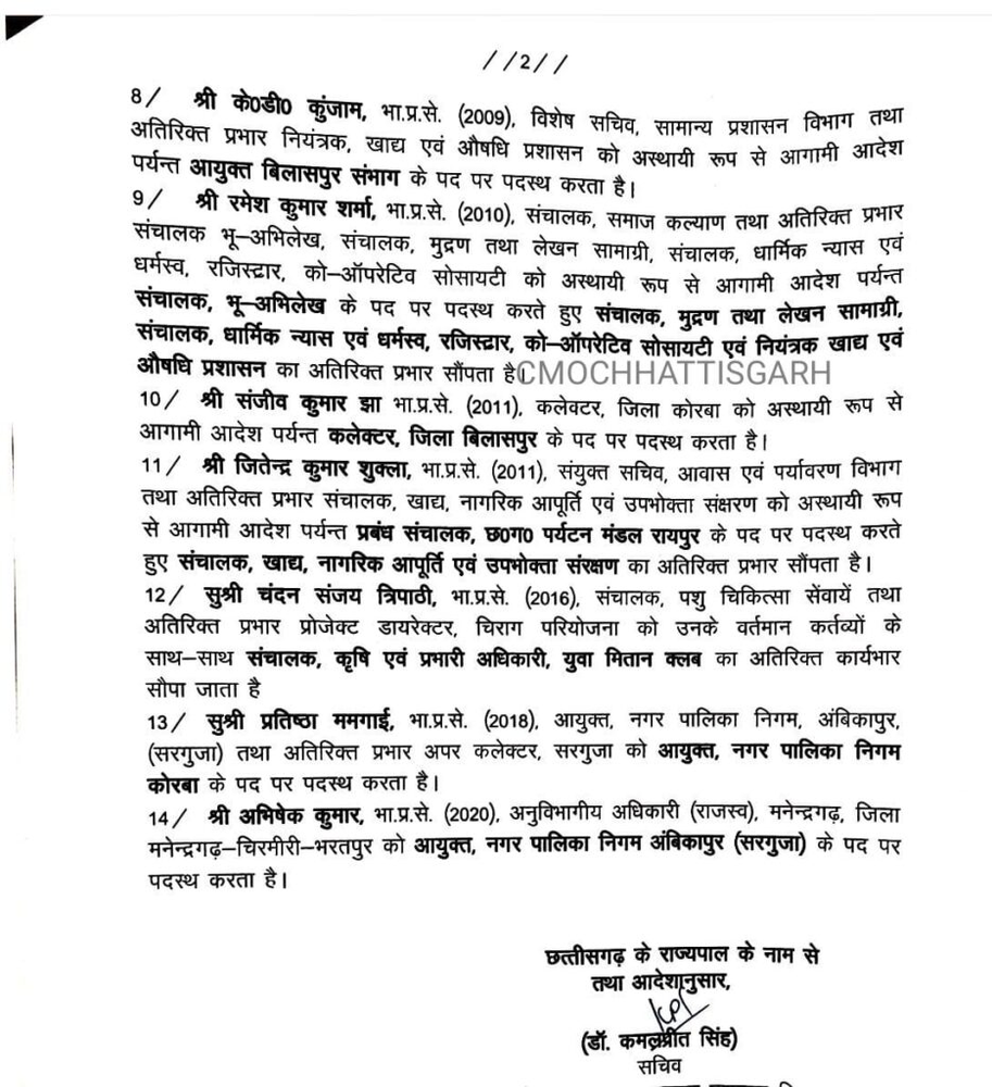 वर्तमान में निगम आयुक्त के पद पर सेवाएं दे रहे संयुक्त कलेक्टर प्रभाकर पांडेय जिला पंचायत सीईओ मुंगेली के पद पर पदस्थ किए गए हैं। यहां बताना होगा कि हाल ही में ईडी की टीम ने निगम आयुक्त प्रभाकर पांडेय के बंगले पर तड़के छापामारी की थी। अलसुबह से देर शाम तक जांच चली थी। उस दिन निगम आयुक्त नदारद थे। जिसको लेकर चर्चाओं का बाजार गर्म था। कोल स्कैम के मामलों में ईडी की जांच की रडार में कोरबा जिला शिखर पर है । इस बीच शनिवार को राज्य शासन ने निगम आयुक्त के पद पर आईएएस की पदस्थापना कर दी है। आईएएस सुश्री प्रतिष्ठा ममगई तेज तर्रार अधिकारी हैं। ऐसे में नगर पालिक निगम कोरबा क्षेत्र की जनता को उनके कार्यदक्षता का अपेक्षित लाभ मिलेगा।