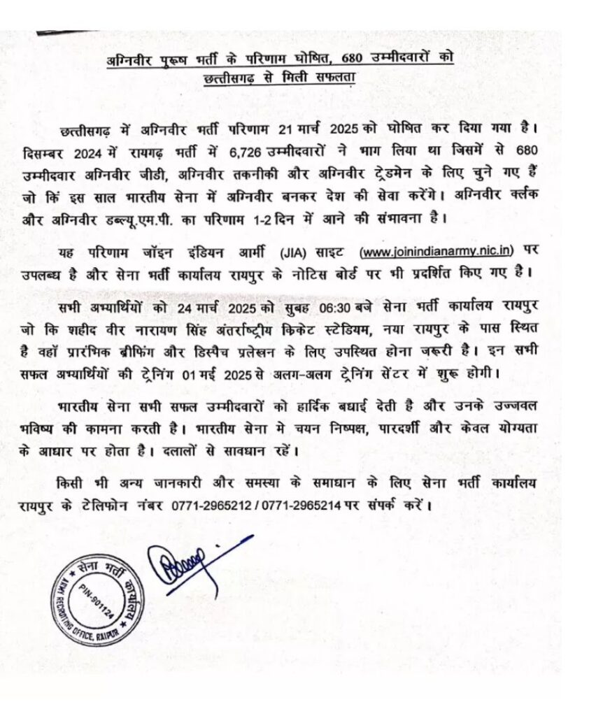 सभी सफल अभ्यर्थियों को 24 मार्च को सुबह 06ः30 बजे सेना भर्ती कार्यालय रायपुर शहीद वीर नारायण सिंह अंतर्राष्ट्रीय किकेट स्टेडियम, नया रायपुर में प्रारंभिक ब्रीफिंग और डिस्पैच प्रलेखन के लिए उपस्थित होना आवश्यक है। इन सभी सफल अभ्यार्थियों की ट्रेनिंग 01 मई 2025 से अलग-अलग सेंटर में दी जाएगी। किसी भी अन्य जानकारी और समस्या के समाधान के लिए सेना भर्ती कार्यालय रायपुर के टेलीफोन नंबर 0771-2965212, 0771-2965214 पर संपर्क किया जा सकता है।