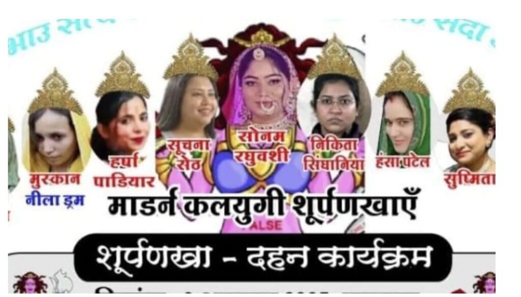 न्यूज़ 18 की रिपोर्ट के अनुसार कार्यक्रम के आयोजक अशोक दशोरा ने कहा कि शूर्पणखा के पुतले पर इंदौर की सोनम रघुवंशी, मेरठ की मुस्कान, राजस्थान की हर्षा, जौनपुर की निकिता सिंघानिया, दिल्ली की सुष्मिता, मेरठ की रविता, फिरोजाबाद की शशि, बेंगलुरु की सूचना सेठ, मुंबई की चमन उर्फ़ गुड़िया, औरैया की प्रियंका और देवास की हंसा की तस्वीर नजर आएगी।